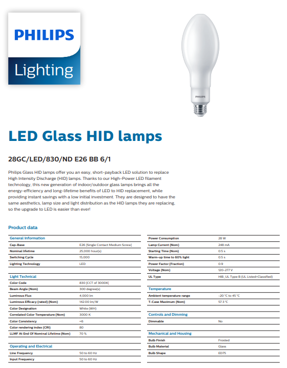 LAMPE DEL 28W 3K NON DIM 120V